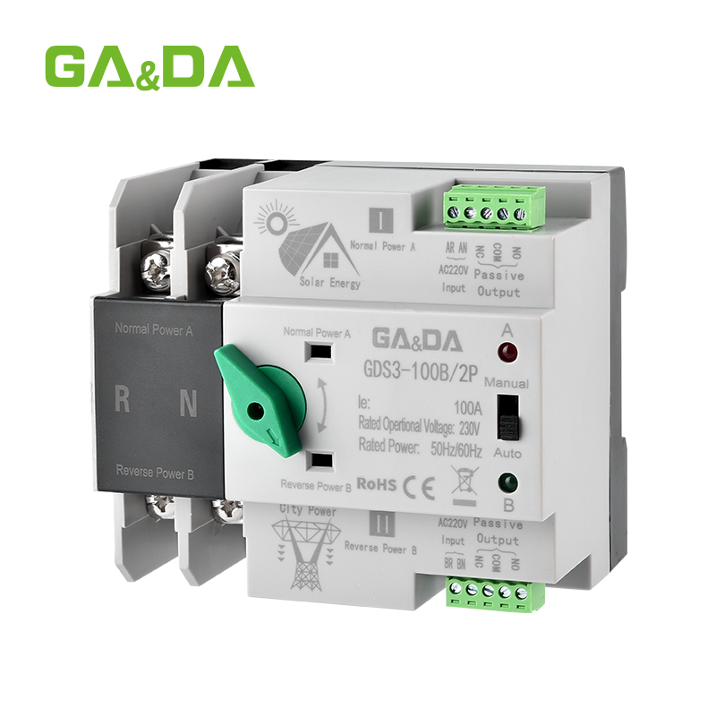 The GDS3-100B automatic dual power transfer switch 100A ensures seamless power changeover between mains and generator, ideal for industrial control panels.